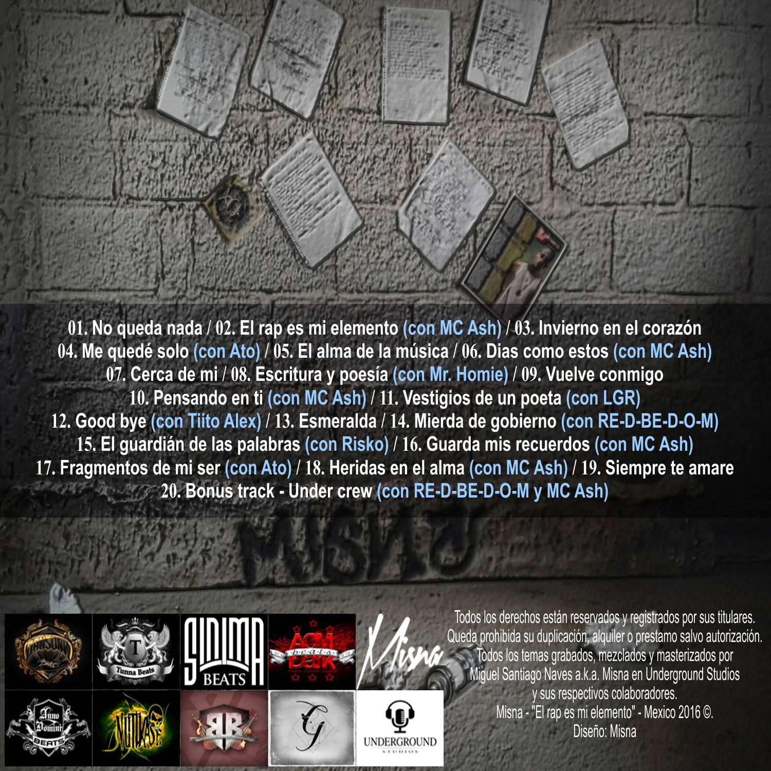 ¡Álbum resubido! 50 años Hip Hop. El artista mexicano Misna nos presenta su nuevo trabajo titulado "El rap es mi elemento" grabado, mezclado y masterizado en Underground Studios, después de un largo tiempo llega este material con temas y ritmos muy variados, el disco cuenta con 20 cortes con colaboraciones a nivel nacional e internacional acompañados de artistas como: MC Ash, Ato, Mr. Homie, LGR, Tiito Alex y RE-D-BE-D-O-M. Fotografía: MC Ash, Diseño: Misnarap.