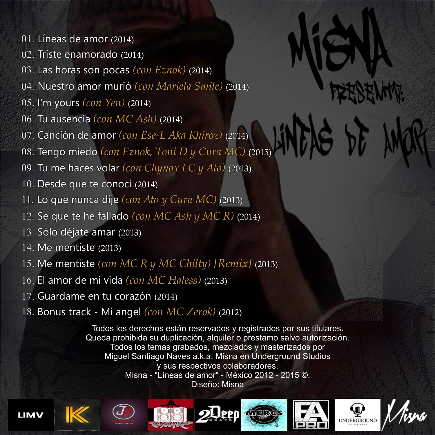 | ¡Álbum resubido! 50 años Hip Hop. En el año 2012 el rapero Misnarap empieza a trabajar en una nueva maqueta titulado "Líneas de amor" con temáticas variados como desamor, decepción, desconfianza, traición, rupturas, etc; el disco se compone de 18 cortes, cuenta con colaboraciones nacionales e internacionales, artistas como Eznok, Mariela Smile, Yen, MC Ash, Ese-L a.k.a Khiroz, Toni D, Cura MC, Chynox LC, MC Chilty, MC Haless y MC Zerok, material grabado, mezclado y masterizado en Underground Studios y sus respectivos colaboradores. Producciones de: Shiro Sagisu, Romz, Kyu Tracks, Alonso Prods, 2Deep, Mercs, EAPro, Jec Produce, Slantize y Yiruma. Mas que una maqueta es un recopilatorio de temas que fueron saliendo y al final se hizo un catalogó de canciones y en el año 2015 seria publicado, además de que se han remasterizado los tracks: 12, 13, 14, 15, 16 y 18 para una mejor calidad de audio. El diseño corre a cargo de Misna. |